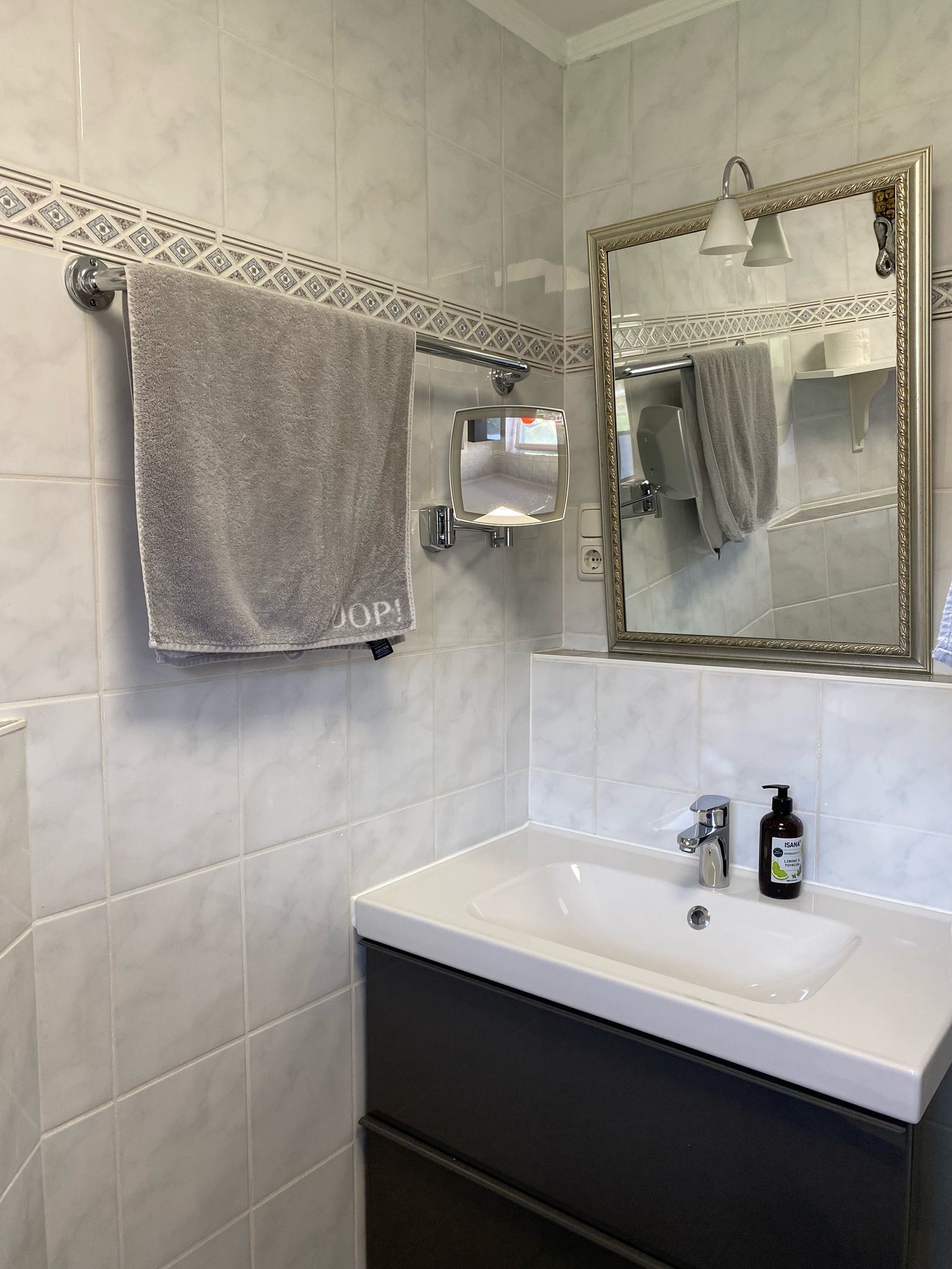 Unser helles Badezimmer mit Tageslicht bietet alles, was Sie für einen angenehmen Start in den Tag brauchen. Die Dusche sorgt für Erfrischung, während der stilvolle Waschtisch nicht nur gut aussieht, sondern auch ausreichend Stauraum für Ihre persönlichen Pflegeartikel bietet.