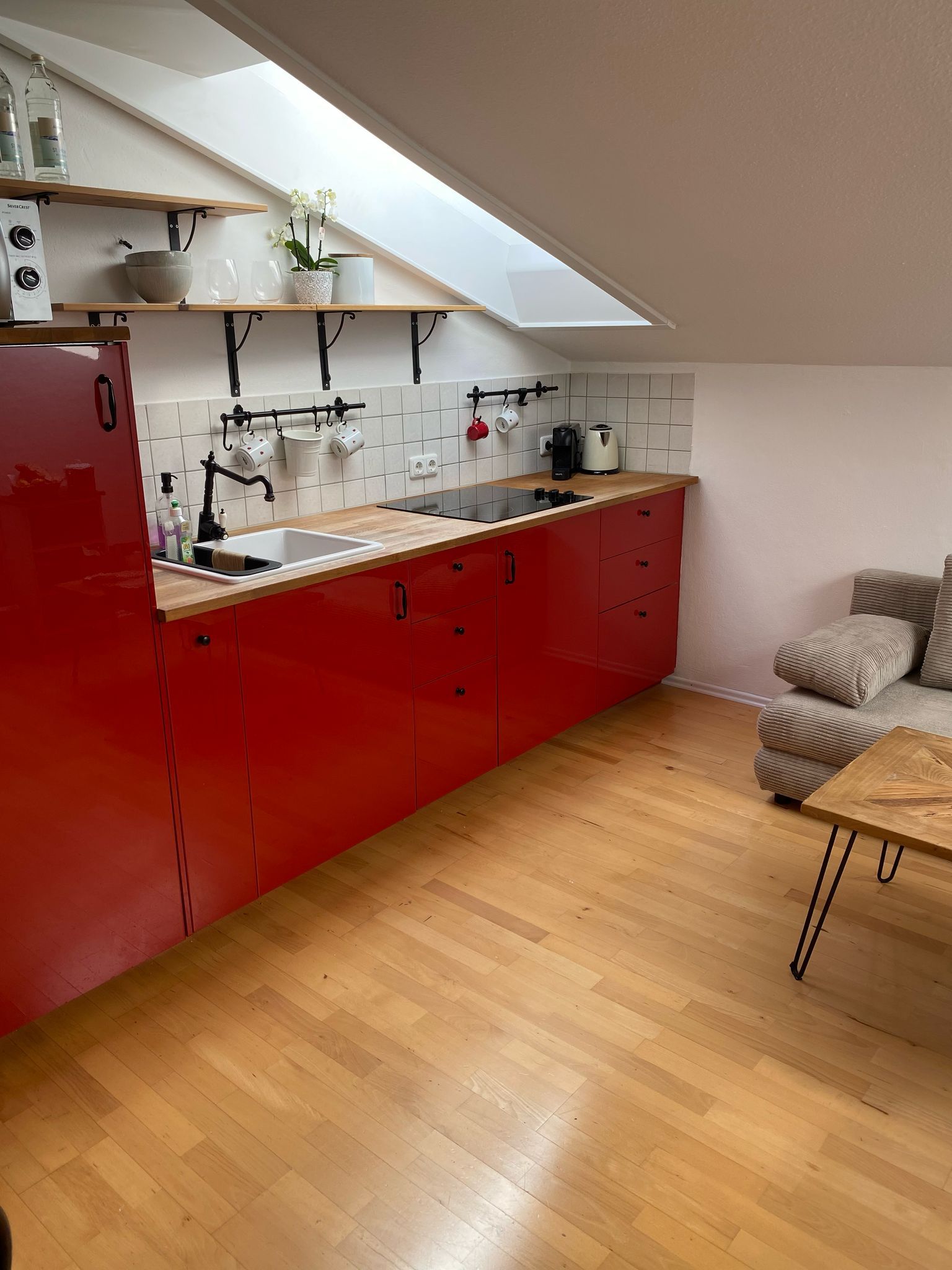 Unser liebevoll gestalteter Wohnraum ist das Herzstück der Ferienwohnung – hier finden Sie alles, was Sie für einen entspannten Aufenthalt brauchen. Die charmante rote Küchenzeile ist nicht nur ein optisches Highlight, sondern auch praktisch ausgestattet mit allem, was das Selbstversorgerherz begehrt: Mikrowelle, Herd, Kühlschrank mit Gefrierfach, Kaffeemaschine, Wasserkocher sowie Geschirr und Küchenutensilien in Standardausstattung.