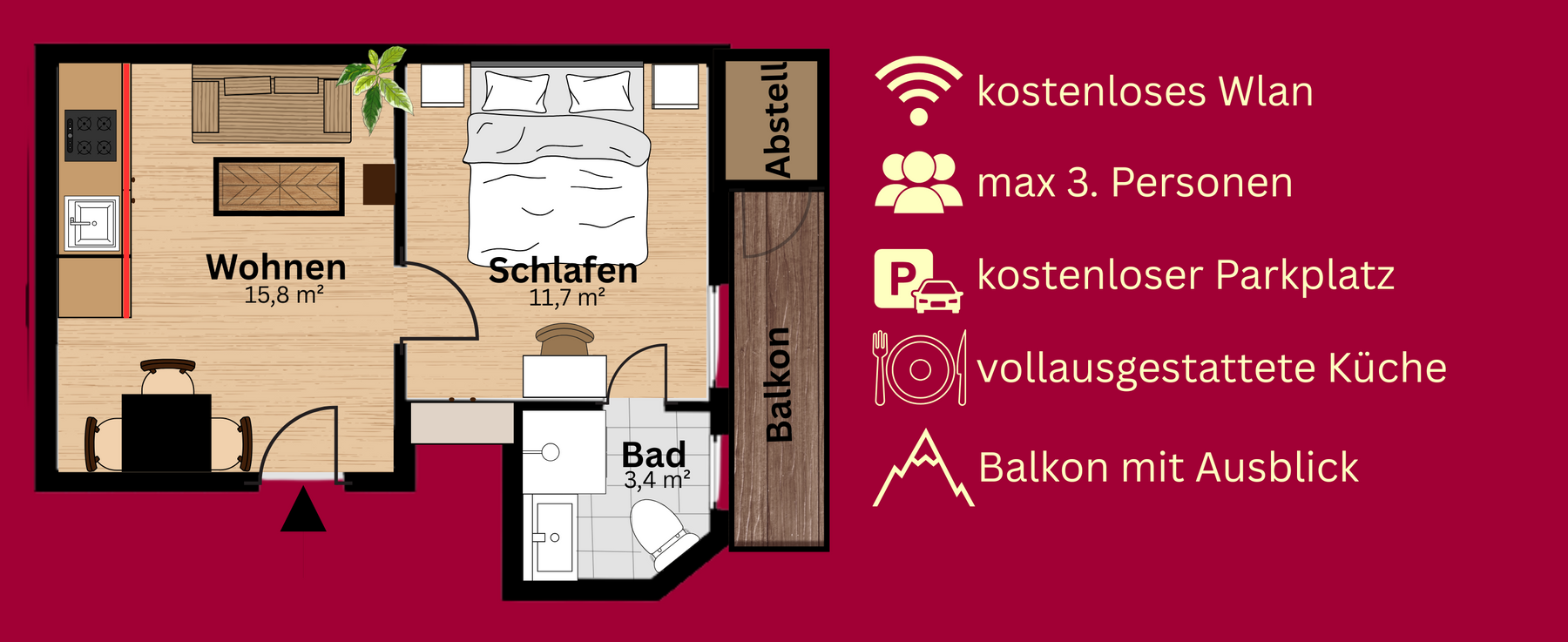 Besonders praktisch: Über den Balkon haben Sie Zugang zu einer kleinen Abstellkammer, in der Sie ganz bequem Koffer oder andere Gepäckstücke verstauen können. So bleibt in der Wohnung selbst mehr Platz und Ordnung – für einen noch entspannteren Aufenthalt.